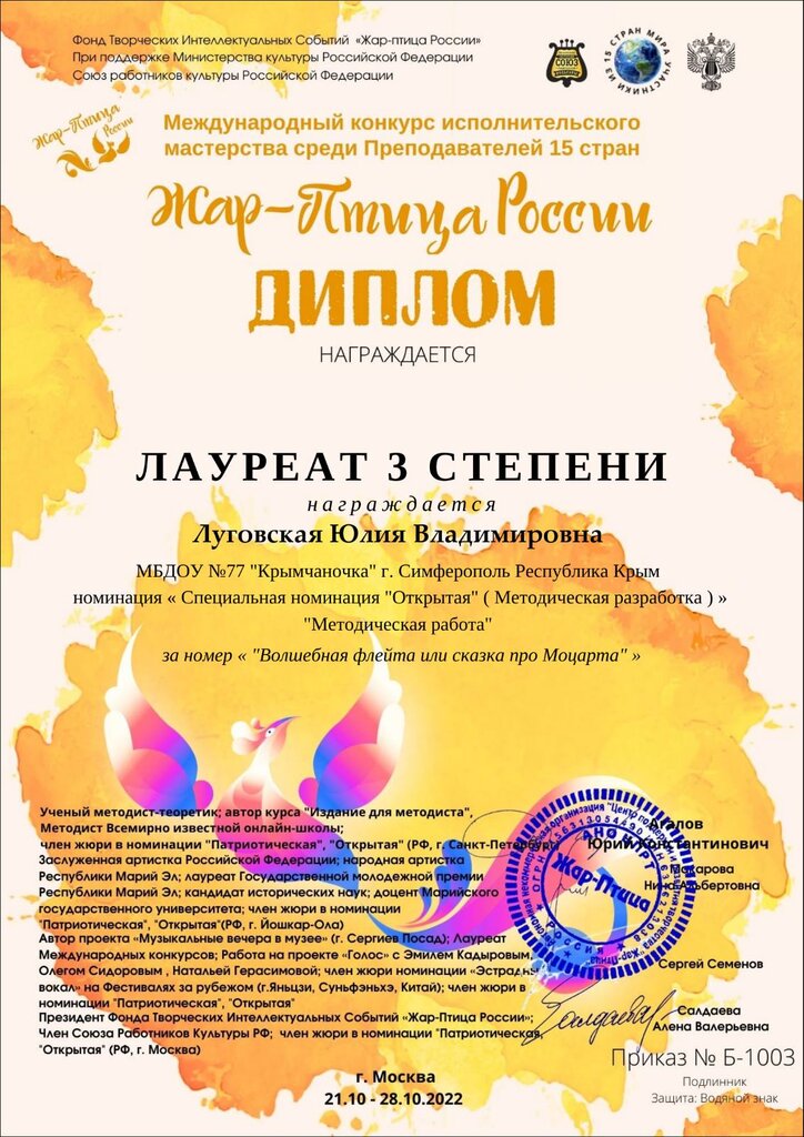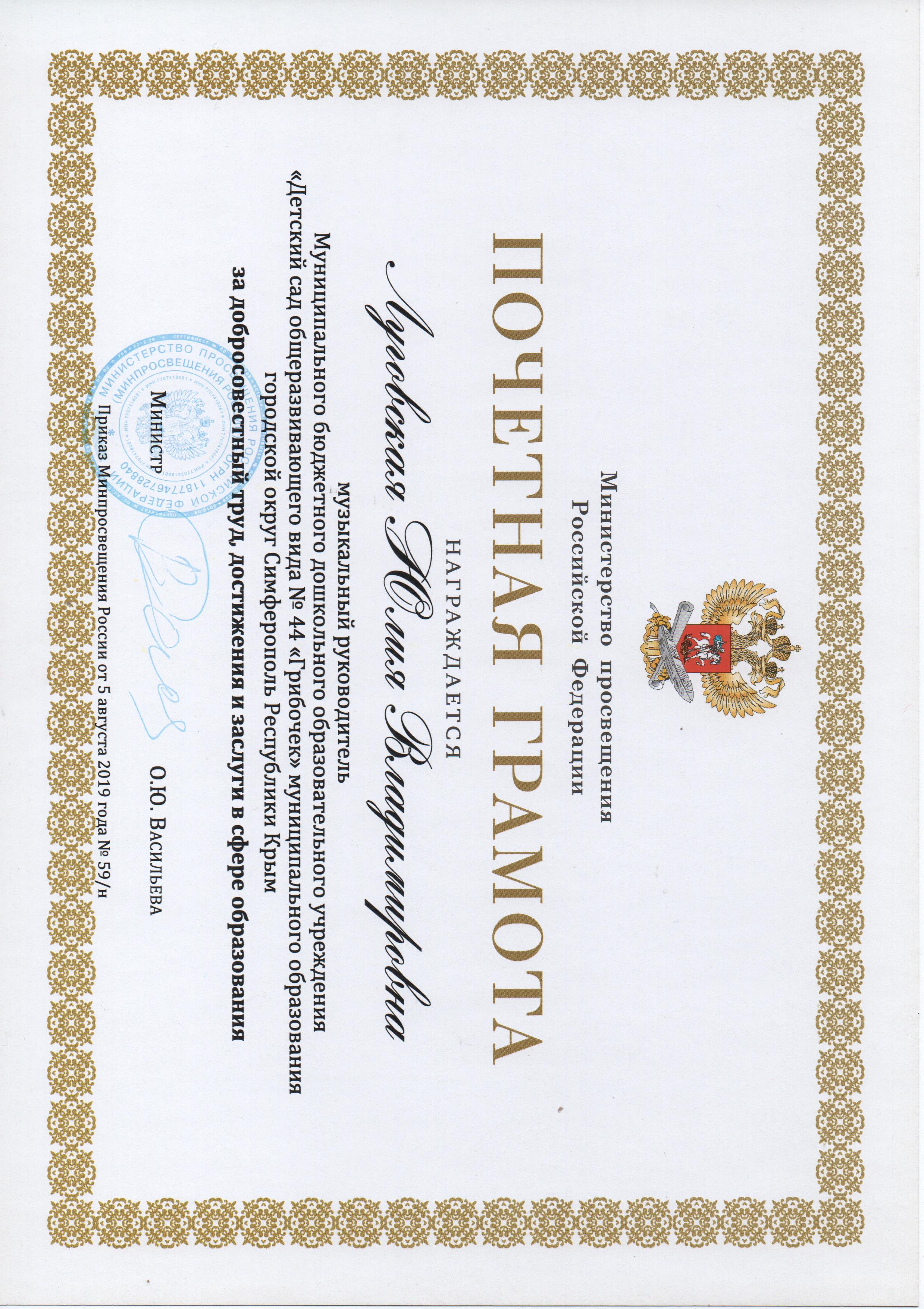 Курсы повышения квалификации: | - ООО «МЦ образования и социально-гуманитарных наук» «Музыкальный руководитель ДОО: проектирование и организация образовательной деятельности в соответствии с ФОП ДО и обновлённым ФГОС ДО» (27.05.2024-10.06.2024. 72 часа) Удостоверение №772421032820 - МБУ ДПО ИМЦ «Особенности учебно-воспитательного процесса для обучающихся с ОВЗ в условиях реализации ФГОС» (06.12-27.12.2024. 72ч) |